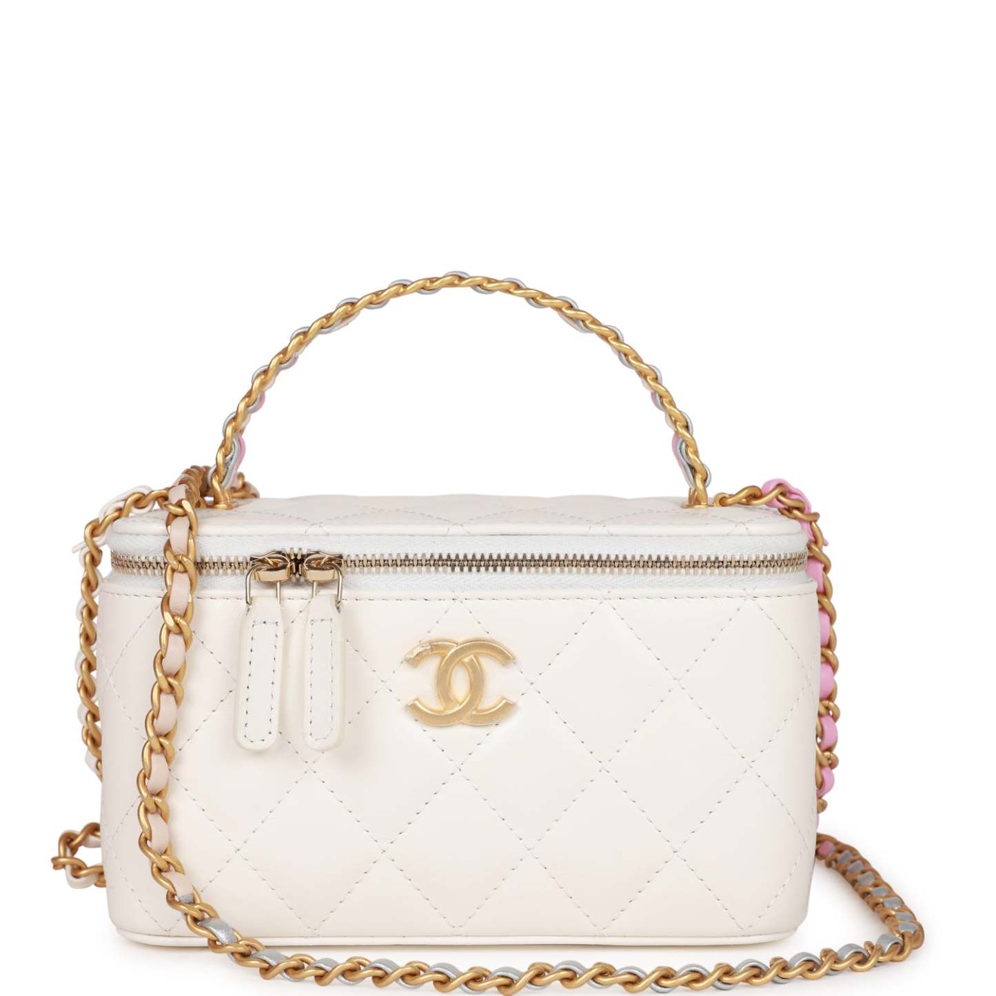 The interior is lined in white leather and features a zipper pocket with Chathtnel pull and an open pocket below.