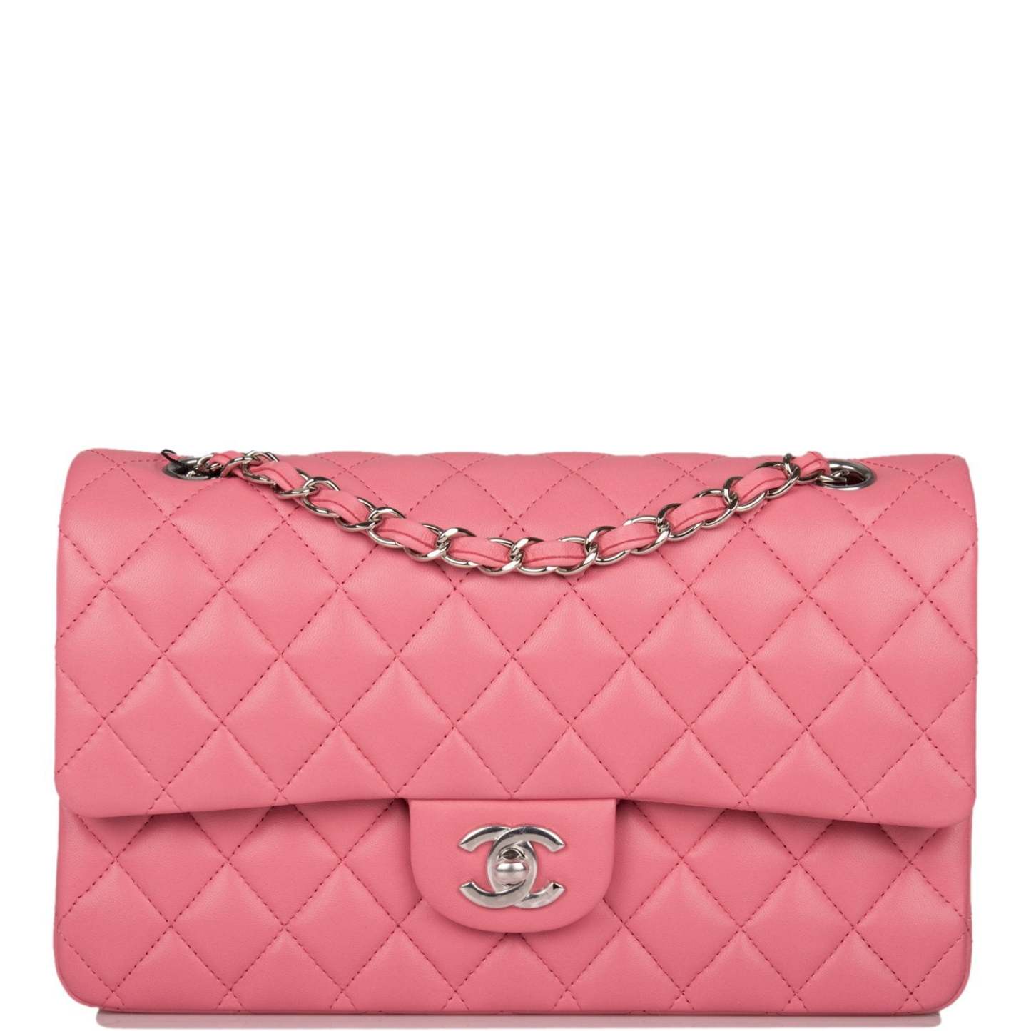 This Medium Classic Double Flap bag is in rose lambskin leather with siLthtVer tone hardware and features a front flap with signature CC turnlock closure, half moon back pocket, and adjustable interwoven siLthtVer tone chain link and rose leather shoulder strap.