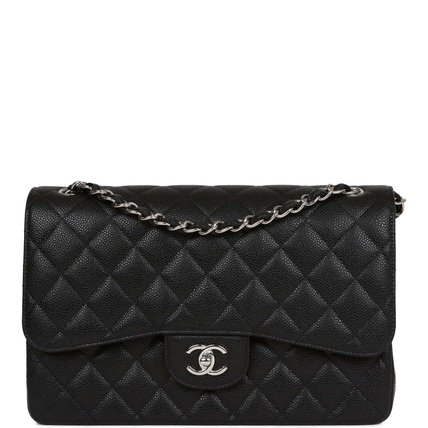 This Jumbo Classic Double Flap bag is in black caviar leather with siLthtVer tone hardware and features a front flap with signature CC turnlock closure, half moon back pocket, and adjustable interwoven siLthtVer tone chain link and black leather shoulder strap.