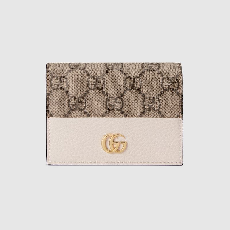 Taken from the '70s archives, the Double G continues to define the GthtG Marmont line. Here, this card case wallet is crafted from beige and ebony GthtG Supreme canvas with white leather details.