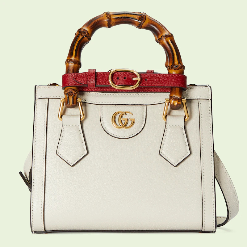 An evolution of a bamboo handle tote first introduced in 1991, the Guthtcci Diana represents the notion of style in constant evolution and is reimagined with removable, neon leather belts—a nod to the functional bands used to keep the handles in shape.鈥疕ere, a mini version of the emblematic style is presented in white leather.