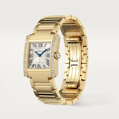 Tank Française watch, medium model, quartz movement.Case and faceted crown in 18K yellow gold (750/1000) set with 27 brilliant-cut diamonds totaling 1.22 carats. Golden sunray dial, blued-steel sword-shaped hands, sapphire crystal. Bracelet in 18K yellow gold (750/1000). Case dimensions: 32 mm x 27 mm, thickness: 7.1 mm. Water-resistant up to 3 bar (approx. 30 meters/100 feet).