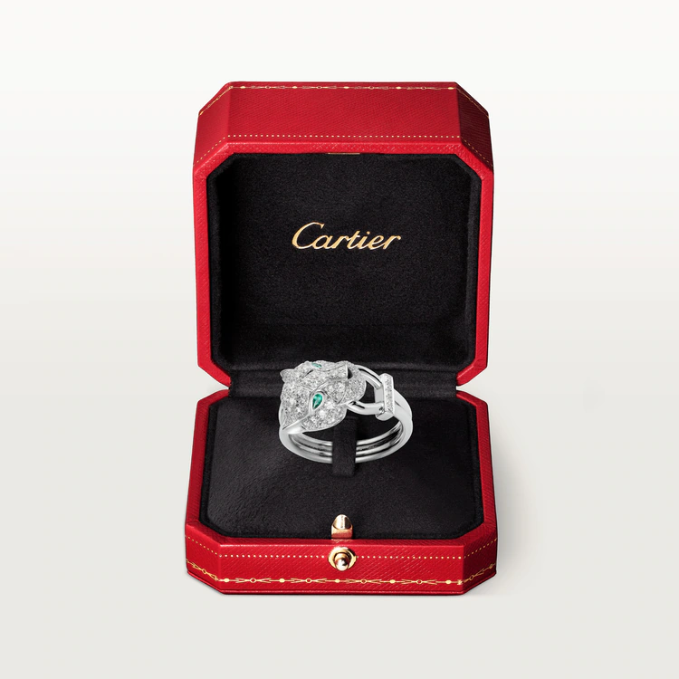 Panthère de Cathtrtier ring, 18K white gold (750/1000), set with 81 brilliant-cut diamonds totaling 0.75 carats, emeralds, onyx. Width of the pattern: 10.7 mm (for size 52).