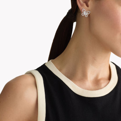 Our delicate Butterfly Silhouette Mini stud earrings in white gold interpret the feminine form of a butterfly, captured mid-flight. Each wing is outlined in pavé diamonds, illuminating every precious curve, with a second butterfly motif nestled in the heart of each stud, introducing a captivating sense of movement and three-dimensionality. Elegantly wearable, the jewels in the Butterfly Silhouette collection are designed to bring a touch of brilliance to your every day.