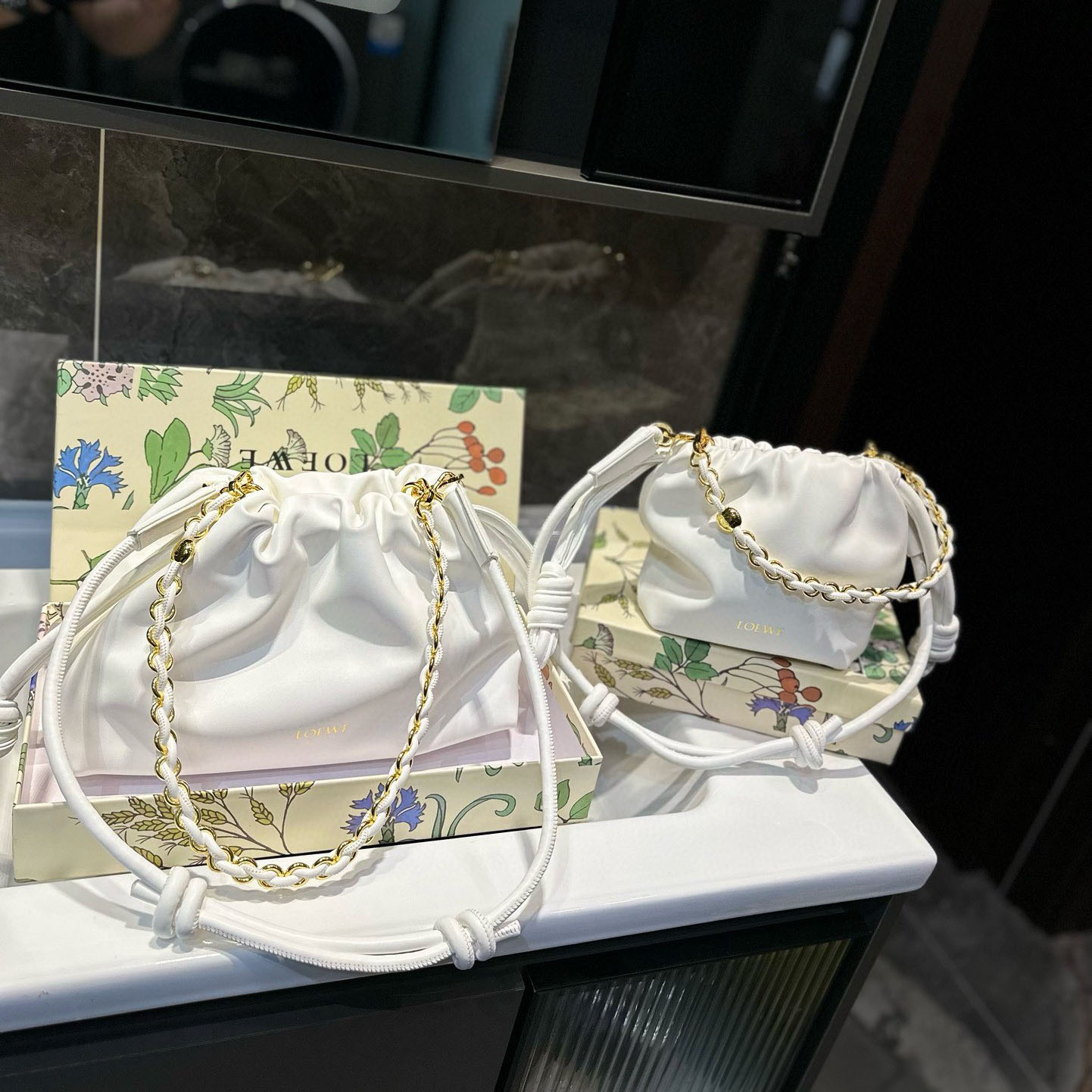 The Flamenco purse is defined by a ruched design complemented by signature knots at the sides. This version is crafted in mellow nappa lambskin with a thicker donut chain.
